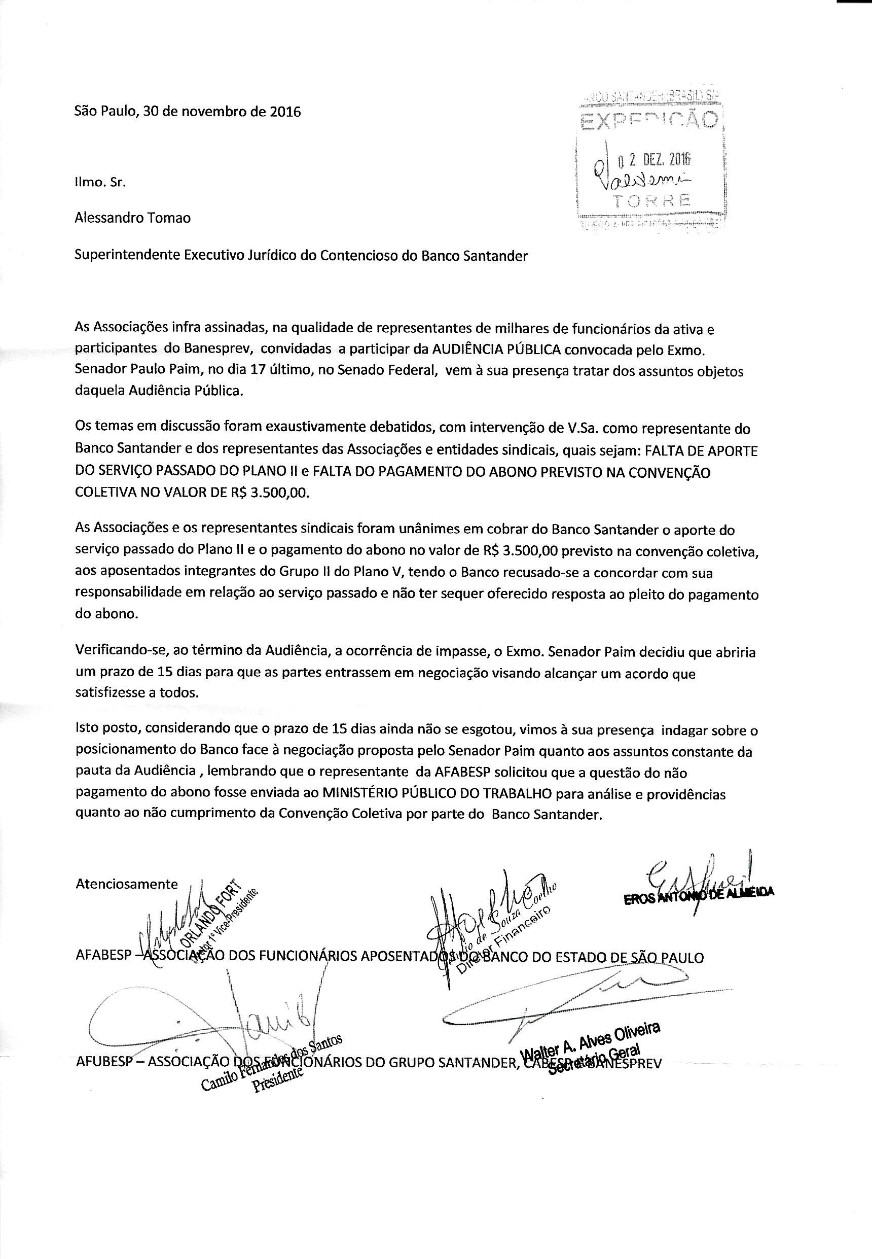 A falta de resposta da instituição para as demandas fez com que a Afubesp, em conjunto com a Afabesp, protocolasse uma carta assinada pelos representantes das duas entidades reivindicando a realização da negociação. A outra associação de representação, Abesprev, acompanha na integra todas as reivindicações.