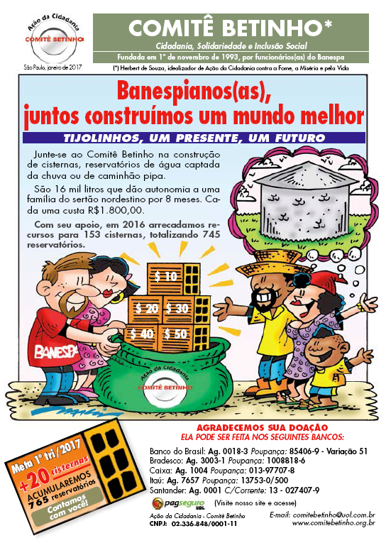O Comitê Betinho pede a colaboração dos banespianos para alcançar a meta de construir 20 cisternas no sertão nordestino no primeiro trimestre de 2017. São aceitas doações de qualquer valor com recebimentos de diversas formas. Saiba mais no jornal da entidade, clicando na imagem abaixo.
