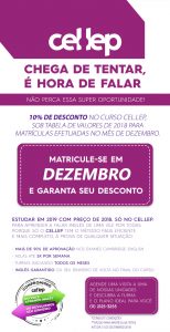 A Cel-Lep oferece aos associados da Afubesp (10%) de desconto do valor dos cursos regulares de inglês e espanhol, com acompanhamento individualizado do desempenho , contar com turmas reduzidas e 94% de aprovação nos exames Cambridge English. As matriculas e formação de turmas são contínuas durante todo o ano ,com módulo direcionados a adulto, adolescentes e crianças . Os cursos são organizados em caráter intensivo, com atenção especial à comunicação oral . Existem 24 unidades da escola em pontos estratégicos da Grande São Paulo e em Campinas