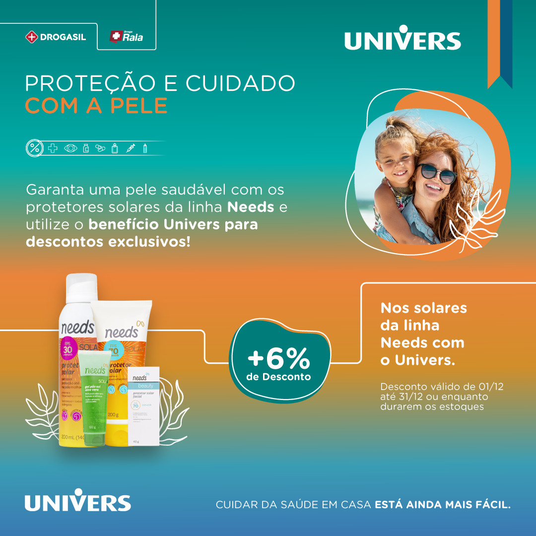 Garanta uma pele saudável com os protetores solares da linha Needs e utilize o benefício Univers para descontos.