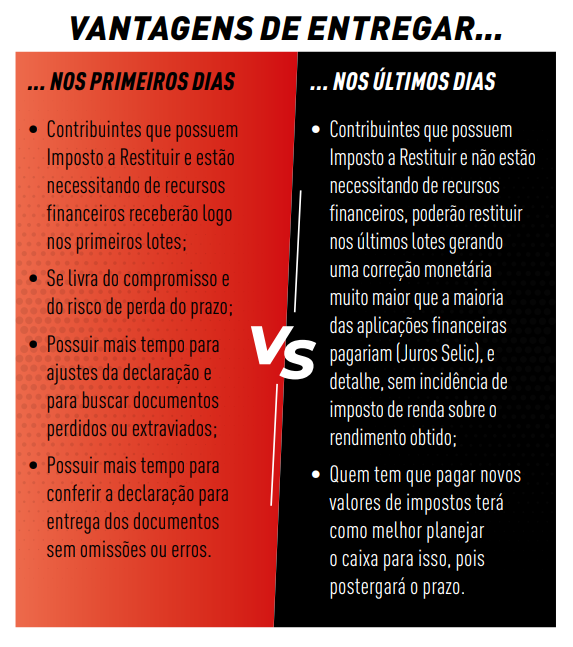 A recomendação dos especialistas é preparar a declaração com bastante antecedência, mas a entrega do documento dependerá de cada caso. “Os contribuintes confundem elaborar a declaração com a entrega do documento. É importante que se saiba que pode estar com o documento totalmente preparado e mesmo assim planejar a melhor data de entrega, que dependerá de variáveis como: situação financeira do contribuinte, se vai ter restituição ou se terá que pagar impostos ao governo, dentre outras questões”, informa Richard Domingos, diretor da Confirp Consultoria Contábil.