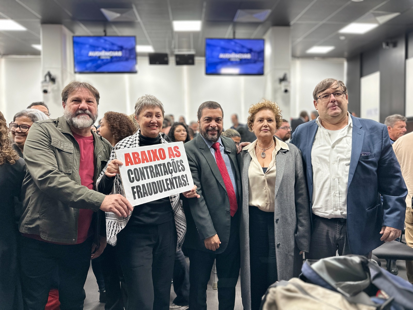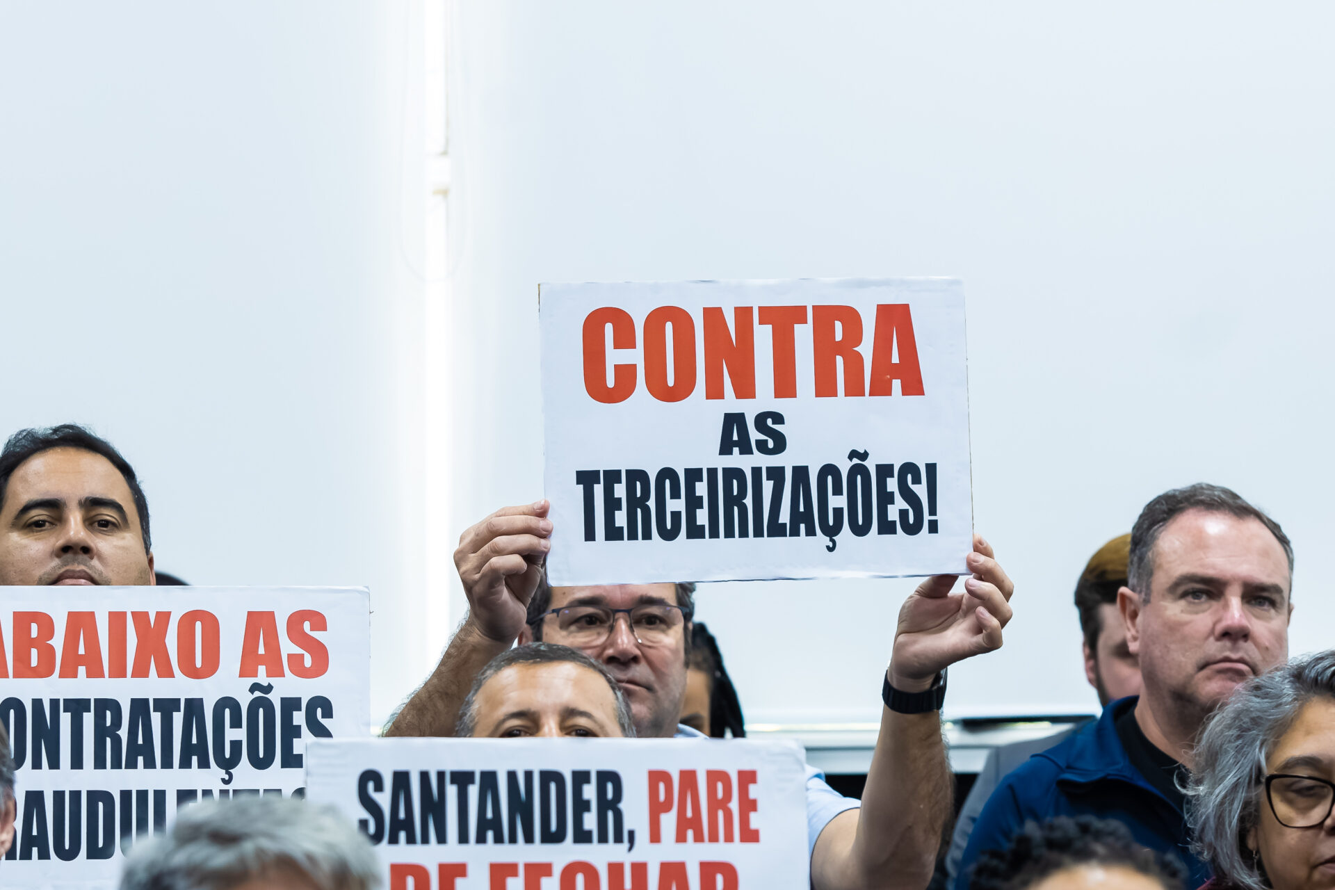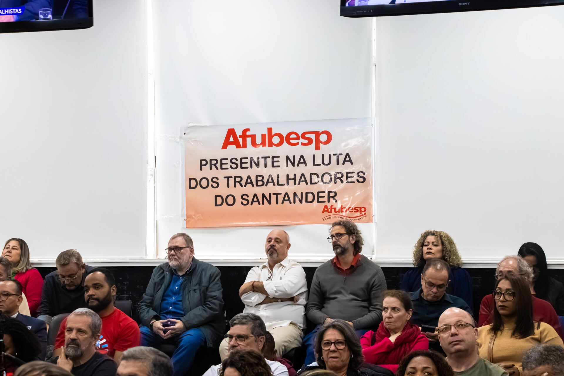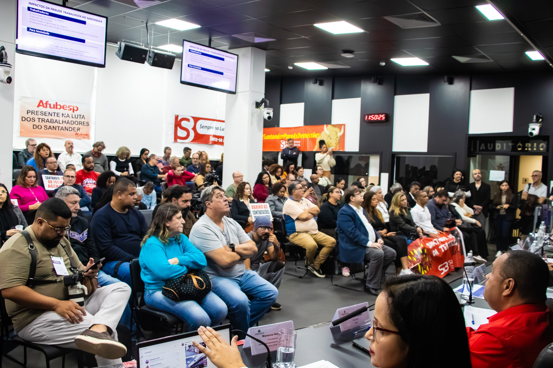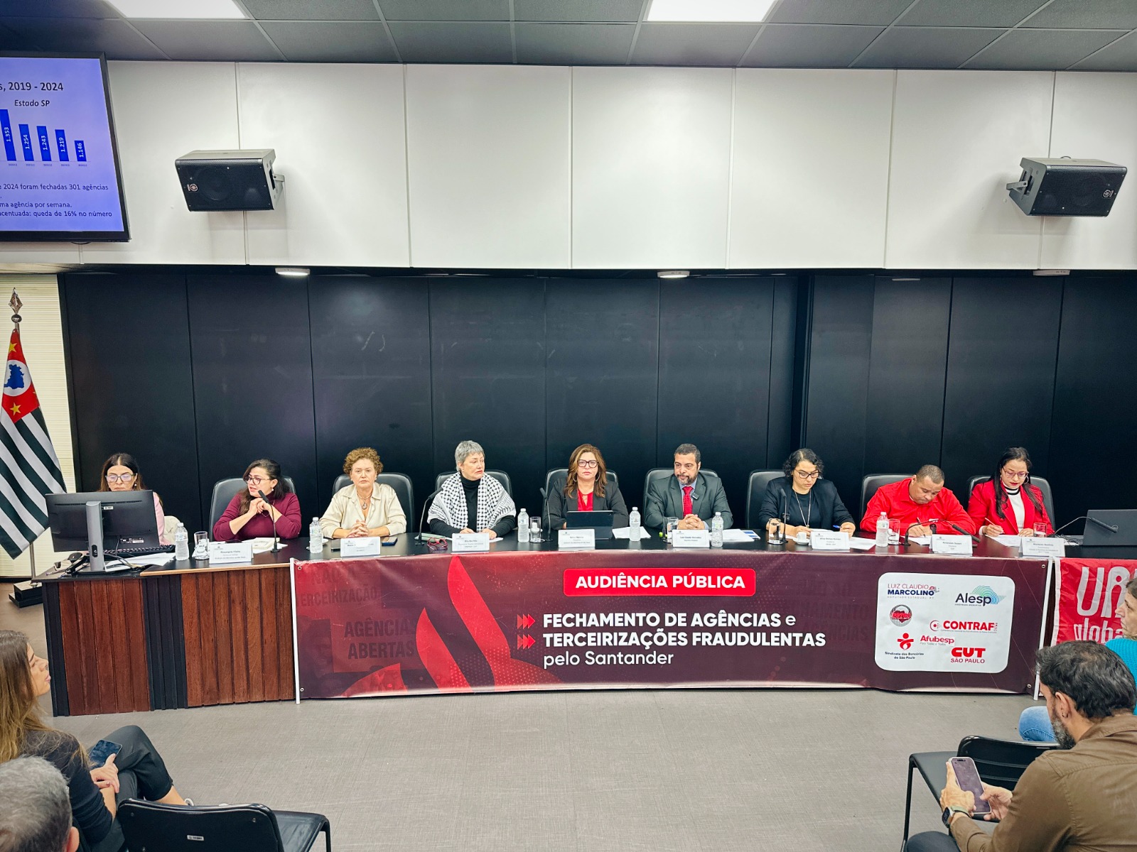 A Afubesp participou na segunda-feira (16) de audiência pública na Assembleia Legislativa do Estado de São Paulo (Alesp) para, junto da categoria bancária, denunciar os ataques do Santander contra os aposentados do Banespa. O debate, proposto pelo deputado estadual Luiz Claudio Marcolino, reuniu entidades sindicais em um ato de resistência contra o fechamento de agências e terceirizações fraudulentas.
