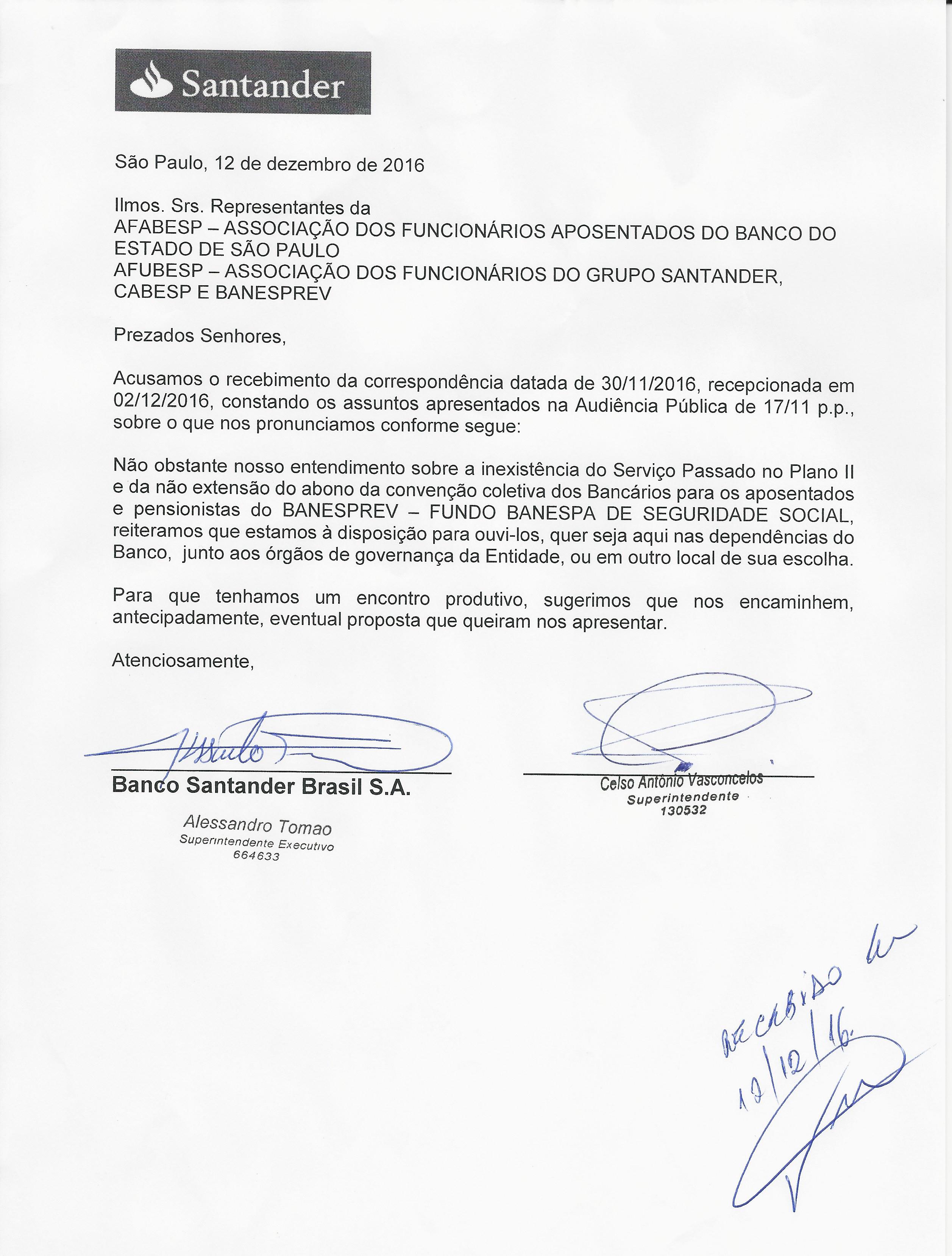 “Inexistência do Serviço Passado do Plano II” e “não extensão do abono” para os aposentados foram as expressões usadas em carta assinada por Celso Antônio Vasconcelos e Alessandro Tomao, representantes do Santander, enviada às associações de banespianos na segunda-feira, dia 12. A correspondência respondeu o ofício protocolado no dia 2 de dezembro cobrando posicionamento do banco sobre instalação de mesa de negociação, a ser intermediada pela Previc, solicitada pelo senador Paulo Paim ao final da audiência pública, realizada em meados de novembro em Brasília.